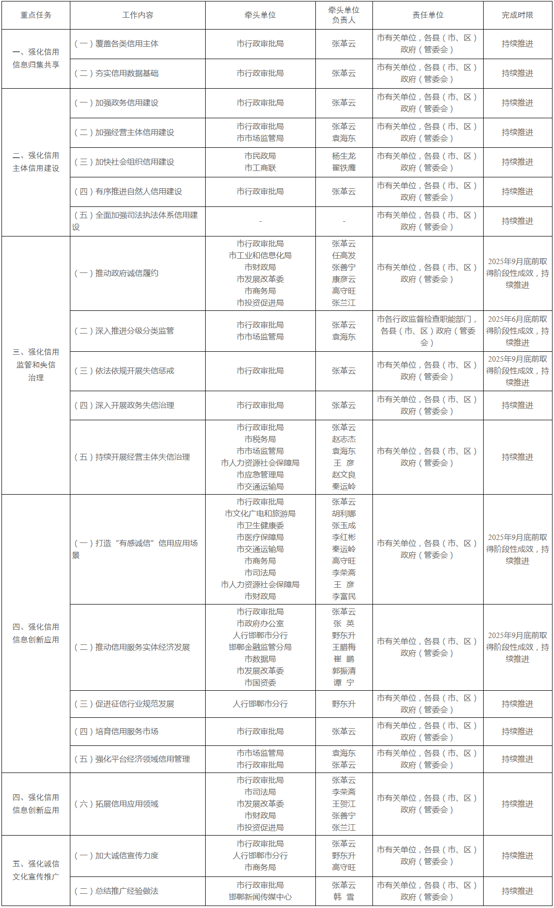 (二)夯实信用数据基础。规范、细化信用信息报送程序,建立全面完整准确的信用记录。“信用邯郸”网站集中公示各类公共信用信息,按照公益性原则向社会公众提供公共信用信息查询服务。各级行业主管部门原则上不再公示本部门业务领域之外的公共信用信息。加强信用信息安全保护,规范信用信息处理程序,提高信用信息基础设施安全管理水平。