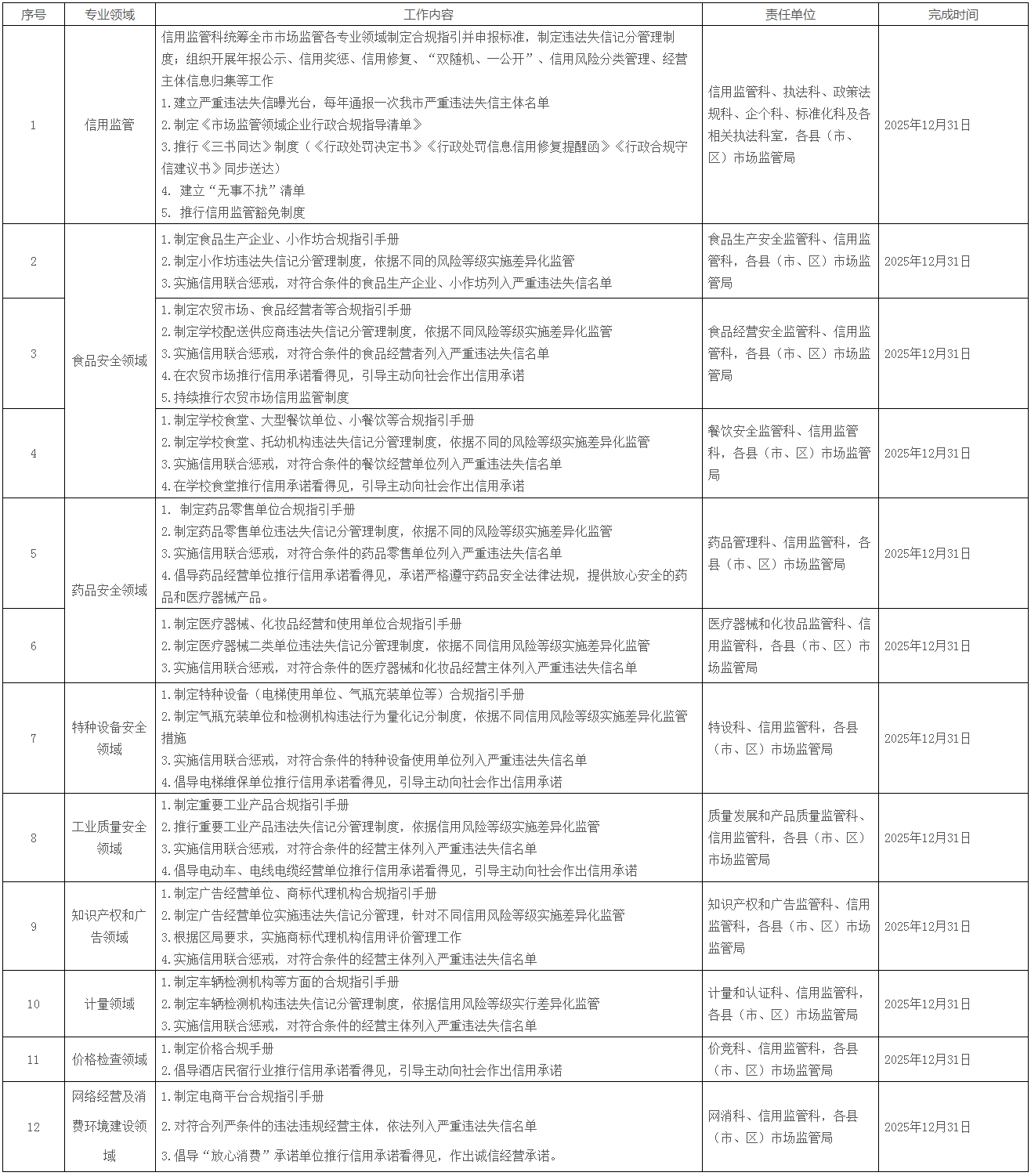 信用监管体系建设工作任务表